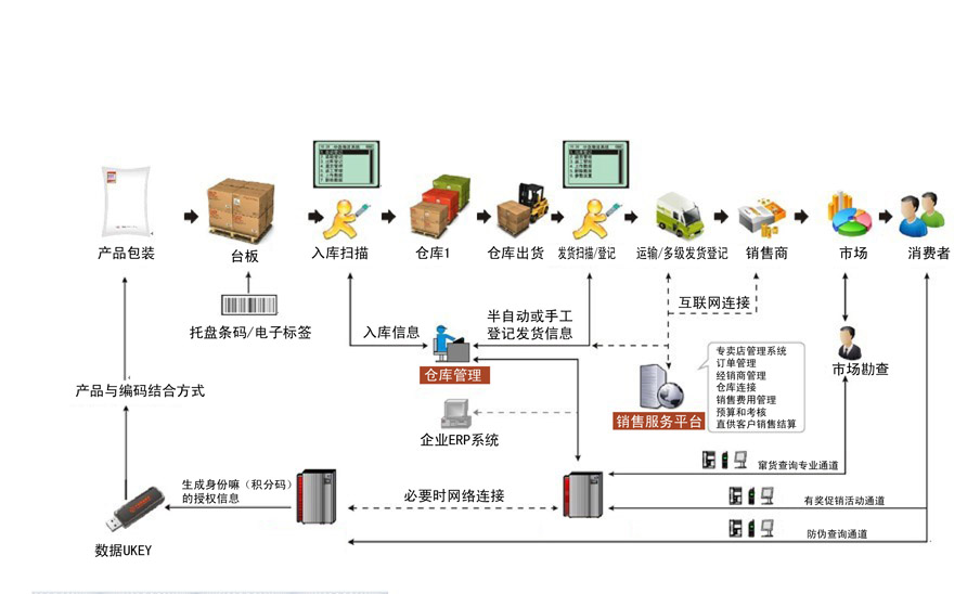 倉儲環(huán)節(jié):從生產(chǎn)(貼)到入庫(可選擇兩套系統(tǒng),掃描入倉和直接不掃描入倉。)直至市場查詢(消費者、稽查人員等)等流通環(huán)節(jié)查詢等功能上,善進(jìn)產(chǎn)品防偽防竄解決方案都具有無法比擬的完整性和靈活性。除此之外,產(chǎn)品防偽防竄解決方案所具備的保證安全性的加密功能,功能的可擴性以及高效的運作成本,都顯示出無比的優(yōu)越性。善進(jìn)“數(shù)字化流向監(jiān)管系統(tǒng)”集成解決方案強大的防偽防竄全方位跟蹤追溯效果,穩(wěn)定的產(chǎn)品性能,專業(yè)的售后服務(wù),正在幫助更多的企業(yè)實現(xiàn)完善的產(chǎn)品跟蹤防偽、防竄貨管理。